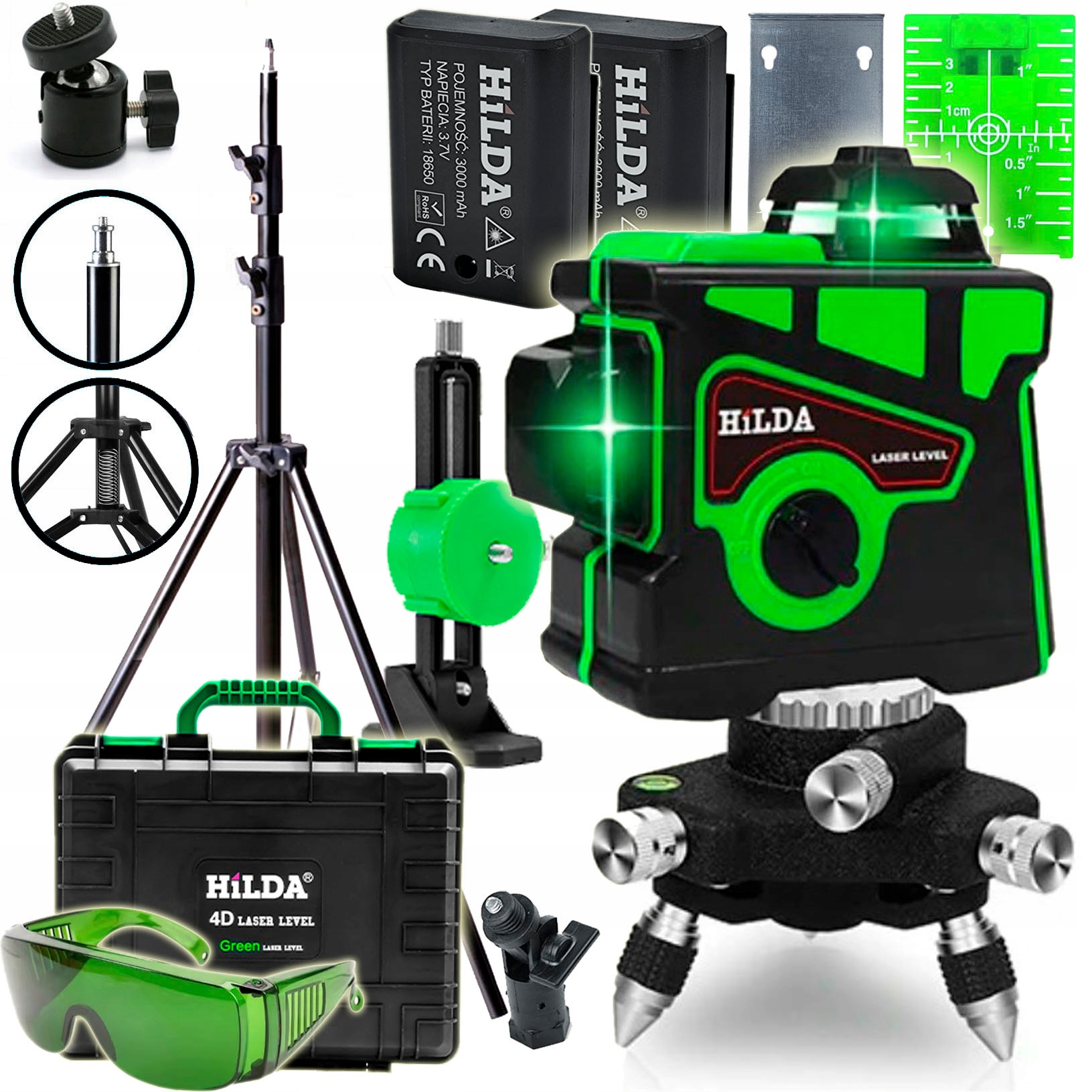 POZIOMICA LASEROWA PŁASZCZYZNOWA SAMOPOZIOMUJĄCA HILDA 12 LINII LASER KRZYŻOWY 3D ZIELONY + TYCZKA STATYW 290cm WALIZKA